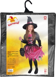 Magisches Karnevalskostüm für kleine Hexen! Das schwarz-pinke Kostüm ist ideal für Mädchen im Alter von 6-8 Jahren, Höhe 117-128 cm. Es zeichnet sich durch pinke Bänder und silberne Sternchen aus.