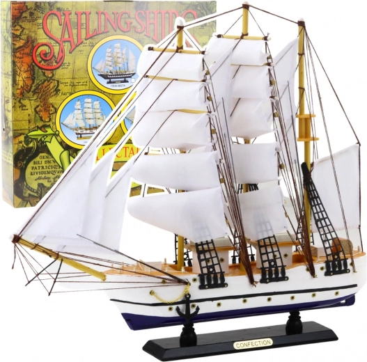 Materialausführung umfasst ein hölzernes Deck, bemalte Seiten und handgespanntes Tauwerk und Segel. Das Schiff steht auf einem schwarzen Sockel mit der Aufschrift „Confection“, die seinen Ausstellungscharakter unterstreicht.