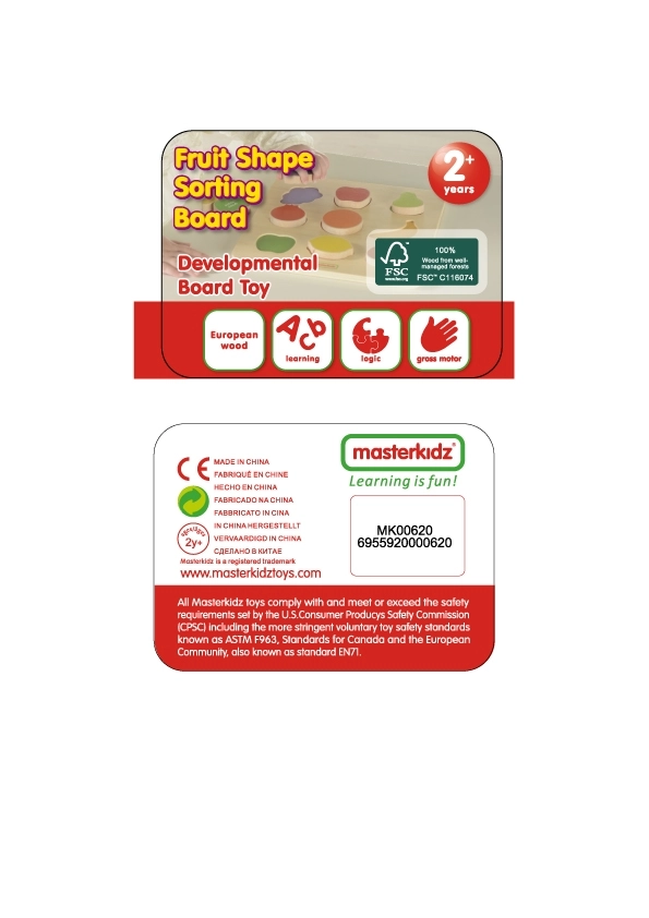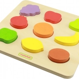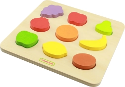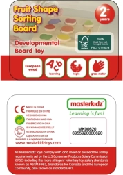 Formsortierer Buntes Obst von der Marke Masterkidz ist ein großartiges Holzspielzeug für Kinder mit vielen Zwecken. Es sorgt nicht nur für Unterhaltung, sondern ermöglicht auch, Fruchtnamen zu lernen und den Fruchtkonsum zu fördern. Das Kind muss die einzelnen Früchte mit den entsprechenden Öffnungen auf der Holztafel abgleichen, was Konzentration und Formanalyse erfordert. Diese Tätigkeit trägt auch zur Entwicklung der Koordinationsfähigkeiten bei.