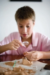 Der Ausgrabungsblock verbirgt farbige Kristalle. Mit Meißel, Pinsel und Lupe trainieren Kinder Genauigkeit, Geduld und sorgfältige Beobachtung – wie echte junge Geologinnen und Geologen.