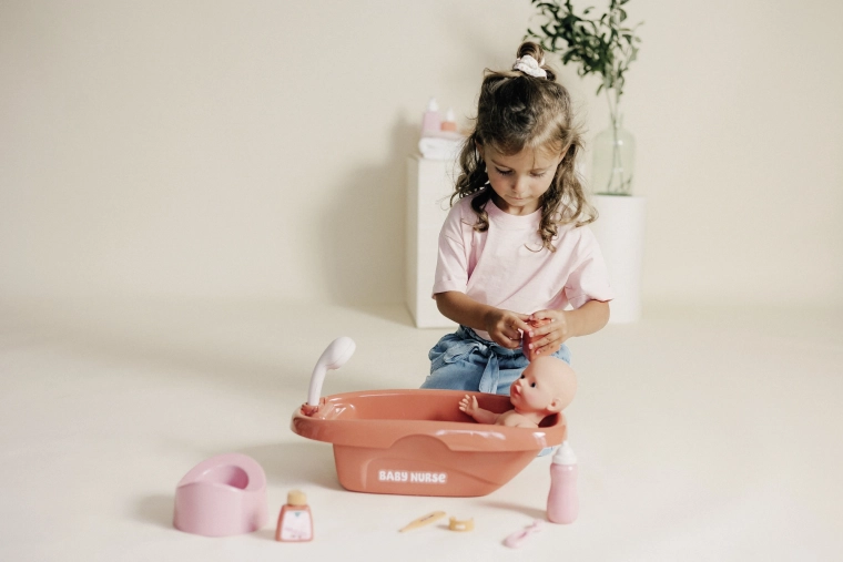 Die große Wanne mit Wasserhahn und abnehmbarer Handdusche mit mechanischer Drehfunktion ermöglicht Kindern, ein echtes Puppenbad nachzuspielen und ihre Fantasie zu entfalten.