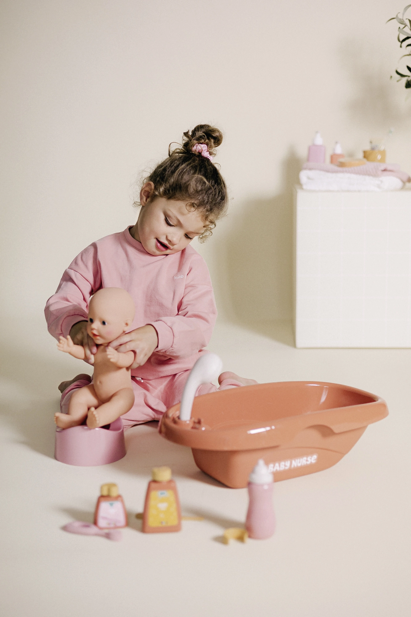 Enthalten sind Fläschchen, Töpfchen, Thermometer, Zahnbürste, Kamm und weitere Pflegefläschchen – alles für Füttern, Hygiene und das Üben von Selbstständigkeit.