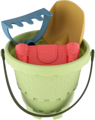 Eimer, Schaufel, Harke und drei Förmchen für kreatives Bauen und Formen von Sand – alles in einem leichten Set.
