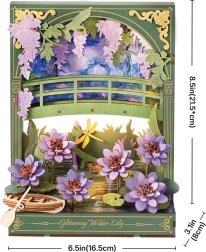 Tauchen Sie ein in die Welt der Kunst und Entspannung mit unserem einzigartigen 3D-Modell der Glitzernden Seerosen, inspiriert von den berühmten Werken von Monet. Nach dem Zusammenbau präsentiert dieses Puzzle eine bezaubernde Szene mit detailliert gestalteten Blumen, einem Boot und einer Holzbrücke, die eine Atmosphäre der Ruhe und Gelassenheit verbreiten. Die LED-Beleuchtung verleiht der Dekoration eine unverwechselbare magische Atmosphäre, die das Spiel des Lichts bei Sonnenuntergang evoziert.