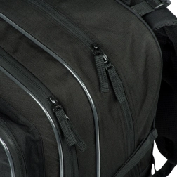 Der Rucksack verfügt über drei separat verschließbare Fächer mit einem spezialisierten Innenorganizer und einer Tasche für einen 15-Zoll-Laptop oder ein Tablet. Das vordere Fach bietet einen praktischen Organizer und einen abnehmbaren Schlüsselkarabiner.