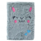 Das Plüschheft liniert mit dem gestickten Motiv des grauen Häschens ist ein bezauberndes und nützliches Produkt, das sofort ins Auge fällt. Der sanfte Plüschumschlag in gedämpftem Grau ist mit einer Stickerei des Häschen-Gesichts mit rosa Ohren und Wangen sowie zwei blauen Herzchen verziert, die dem Produkt Charme und kindliche Freude verleihen.