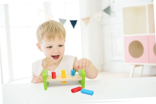 Diese bunte Holzhammerbank mit Plastikeinsätzen von Classic World ist ein hervorragendes Werkzeug zur Förderung der motorischen Fähigkeiten Ihrer Kinder. Mit neuem Design, das Stabilität und Verspieltheit kombiniert, genießen Kinder viel Spaß.