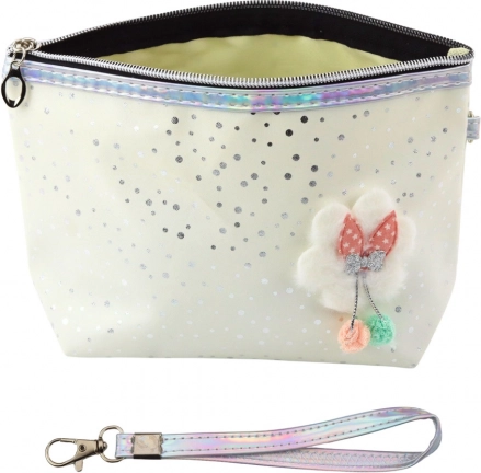Elegante und praktische Kosmetiktasche in weißer Farbe mit glänzender Oberfläche ist ideal sowohl für die Schule als auch für den täglichen Gebrauch. Das universelle Design erlaubt die Nutzung entweder als Federmäppchen für Schulbedarf oder als Kosmetiktasche für kleine Accessoires.
