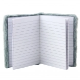 Der weiche Umschlag aus angenehm zu berührendem Plüsch in einem zarten, grauen Farbton verleiht dem Notizblock einen besonderen Charakter. In der Mitte des Umschlags befindet sich ein glitzernder Stern, der die Farbe wechselt und im Kontrast zum weichen Material steht.