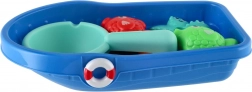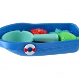 Das blaue Boot liegt stabil im Wasser und fasst weitere Teile. Kinder können damit Tierchen transportieren, Wasser schöpfen und eigene Geschichten erfinden.
