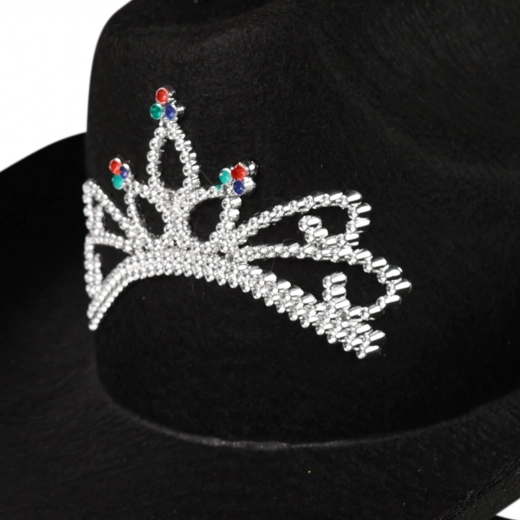 Der schwarze Cowboyhut ist mit einer silbernen Krone verziert, ideal für jede Altersgruppe. Ein stilvolles Accessoire, das Sie unübersehbar macht.