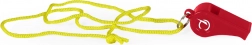 Rote Plastikpfeife an einer gelben Schnur befestigt, ideal für das Signalisieren oder sportliche Aktivitäten.
