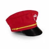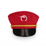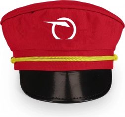 Stylische rote Mütze mit dem Logo der Slowakischen Eisenbahn, schwarzem glänzendem Schirm und gelber Kordel. Ideal zum Spielen des Zugabfertigers.