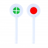 Zwei Plastiksigntafeln mit langen weißen Griffen, eine mit einem grünen und die andere mit einem roten Kreis. Hervorragend für Spiele und Signalisierung beim Training.