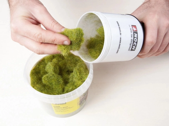 Mittelgrünes Wildgras von der Marke Noch ist ideal für die realistische Gestaltung von Wiesen und Feldern. Dieses spezielle Streumaterial verleiht der Landschaft eine natürliche Atmosphäre und ist geeignet für Modelle im Maßstab H0, TT und 0.