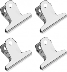 Diese Klammern sind aus langlebigem Metall gefertigt, was ihre Haltbarkeit und Möglichkeit zur wiederholten Verwendung garantiert. Ihre einfache Form und die glänzende, verchromte Oberfläche verleihen ihnen ein professionelles Aussehen. Dank der Öffnung im Griff können die Klammern leicht an einer Tafel oder einem Haken aufgehängt werden.