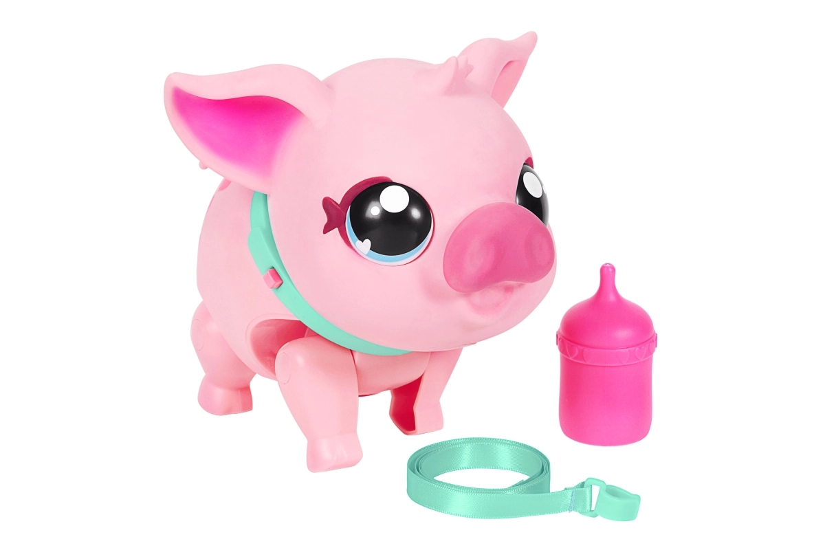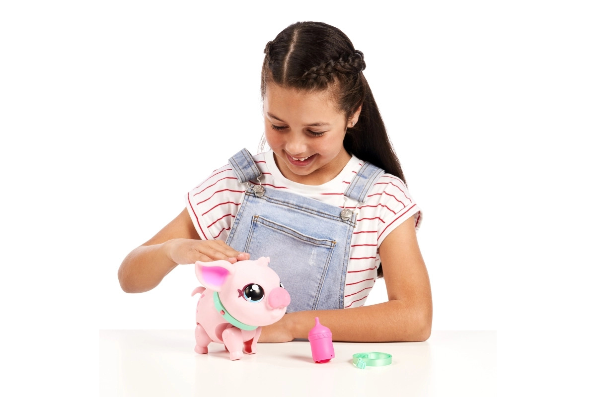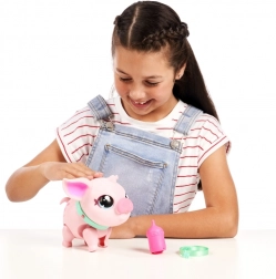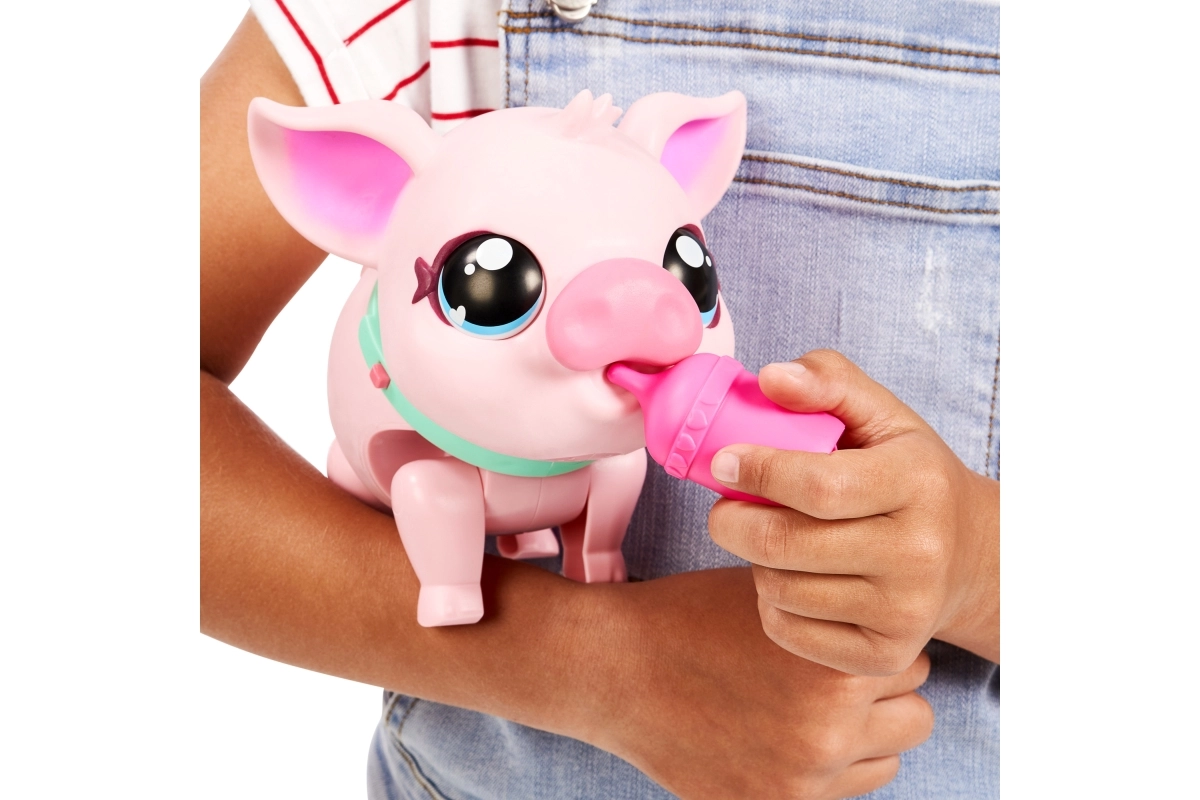 Ein rosafarbenes Fläschchen ist dabei. Füttere dein Schweinchen, streichle es und beobachte seine Reaktionen – Tierpflege wie in echt.