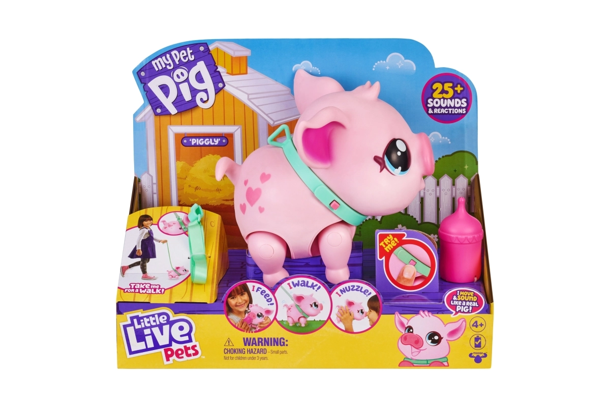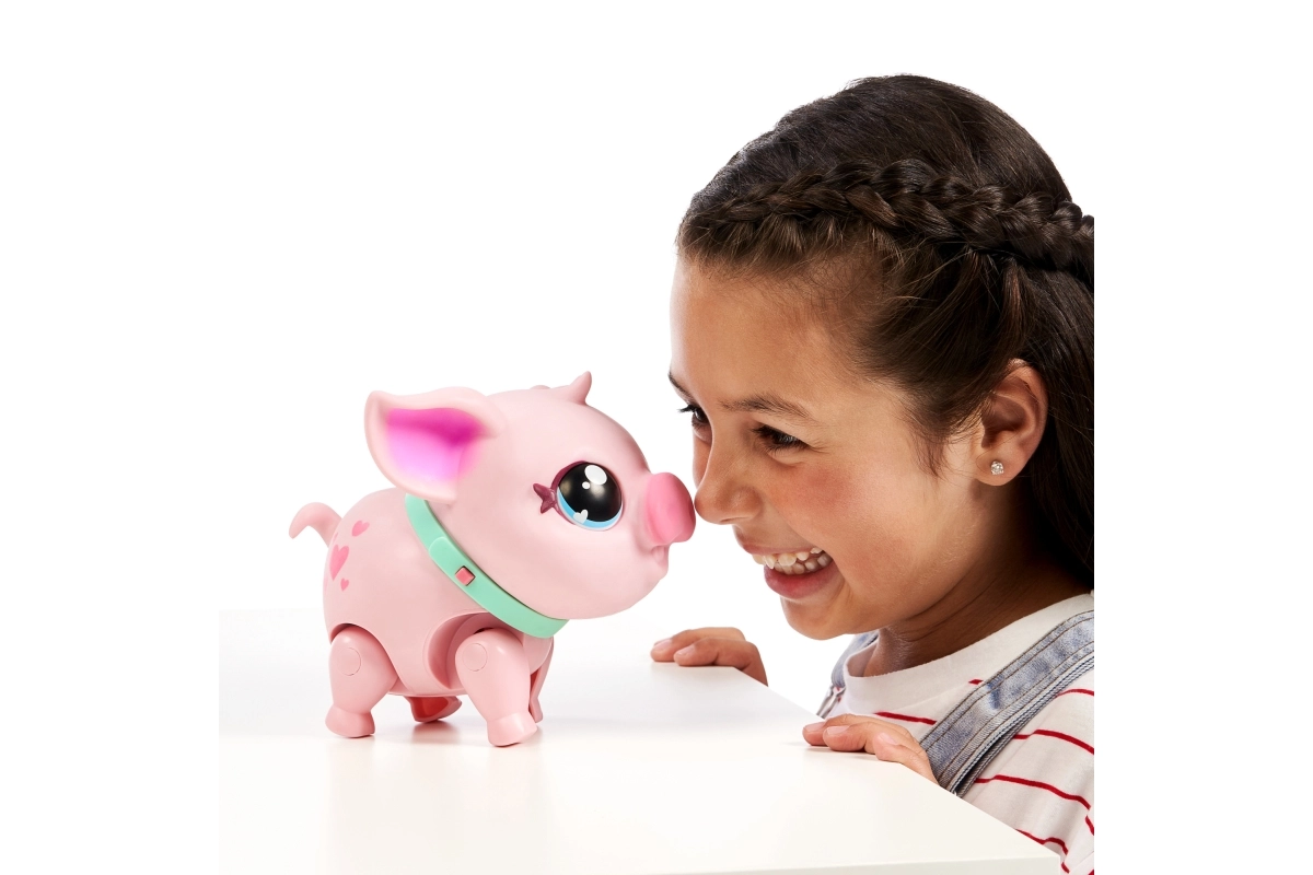Entdecke ein zauberhaftes Haustier, das in Kinderhänden lebendig wird. Piggly ist ein weiches rosafarbenes Schweinchen mit süßen Augen und Halsband, das auf Berührung, Bewegung und Zuwendung reagiert. Mit der Leine nimmst du es ganz einfach mit auf einen Spaziergang, und wenn es Hunger hat, fütterst du es mit dem Fläschchen.