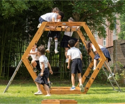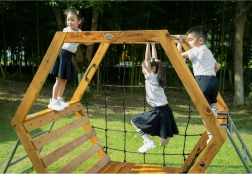 Dieser große Outdoor-Kletterspielplatz mit hexagonalem Grundriss bietet Stabilität, Sicherheit und viele Möglichkeiten für bewegungsreiche Aktivitäten. Kinder können am Seilnetz klettern, über Metallsprossen balancieren und sich an den Monkey Bars hängen – dabei stärken sie den ganzen Körper und verbessern ihre Motorik.