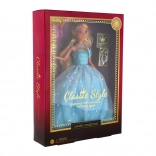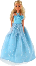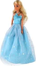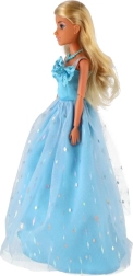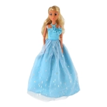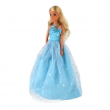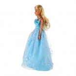 Ein langes, hellblaues Kleid mit zartem Glanz und floralen Verzierungen verwandelt die Puppe in die Königin jeder imaginären Feier.