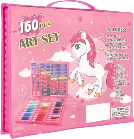 Entdecken Sie die Welt der Fantasie mit diesem kreativen Einhorn-Malset. Im praktischen Kunststoffkoffer finden Sie 160 kreative Werkzeuge – Buntstifte, Filzstifte, Wachsmalstifte, Wasserfarben und weiteres Zubehör, das Kreativität und die Feinmotorik fördert. Ideal für kreatives Schaffen zu Hause und unterwegs dank der kompakten Abmessungen und der übersichtlichen Aufbewahrung.
