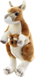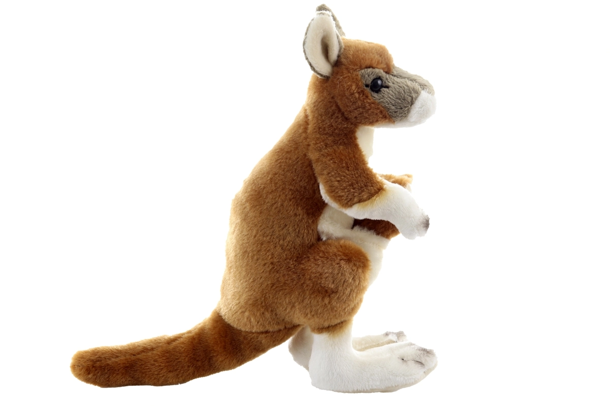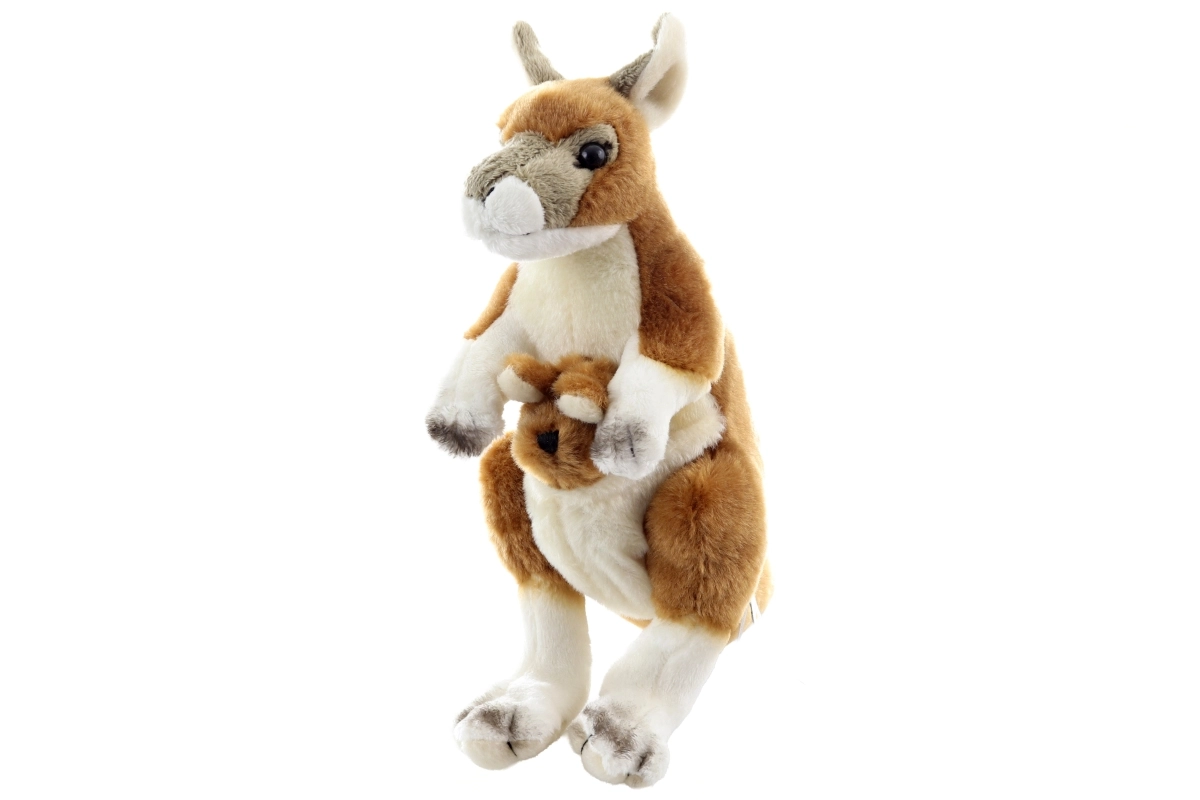 Dieses weiche Plüsch-Känguru mit niedlichem Jungtier in der Tasche schenkt Kindern viel Spaß und Geborgenheit. Realistische Details, der lange Schwanz und große Ohren fördern die Fantasie und unterstützen kreatives Spiel und Rollenspiel. Dank der kompakten Maße liegt es perfekt in kleinen Kinderhänden und lässt sich leicht mitnehmen.