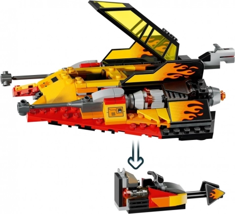 Das öffnende Doppelkockpit verbirgt einen abnehmbaren Speeder – durch Drücken des Sitzes oder des Kopfes der Minifigur wird der Speeder sofort in Aktion gestartet.