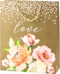 Diese Geschenktasche besticht durch das feine Zusammenspiel von schönen, bunten Blumen und der Aufschrift "Love". Kleine Brokatpunkte oben auf der Tasche verleihen ihr Sanftheit und Leichtigkeit.