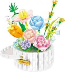 Das Set enthält Rosen, Tulpen, Maiglöckchen und weitere Blumen, die dem Modell ein realistisches Aussehen verleihen. Die Blumen sind in einem eleganten geflochtenen Korb mit Henkel platziert, was das erstellte Modell zu einer interessanten Innenraumdekoration macht.