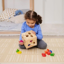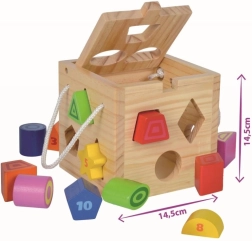 Dieser aufklappbare Holzwürfel bietet das klassische Spiel zum Erkennen von Formen. Kinder setzen die einzelnen Teile in die richtigen Öffnungen und trainieren Augen-Hand-Koordination, logisches Denken und Konzentration. Dank der leuchtenden Farben macht das Lernen ganz natürlich Spaß.