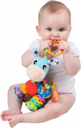 Das Pferdchen Klusáček ist der ideale Begleiter zu Hause und unterwegs. Weiche Textilien mit verschiedenen Strukturen, raschelnde Öhrchen, klingelnde Ringe und ein rasselndes Beinchen fördern die Sinne des Kindes auf natürliche Weise und motivieren zum Greifen. Kontrastreiche Muster und fröhliche Farben unterstützen die visuelle Wahrnehmung, während der Beißring in Apfelform empfindliches Zahnfleisch beruhigt.