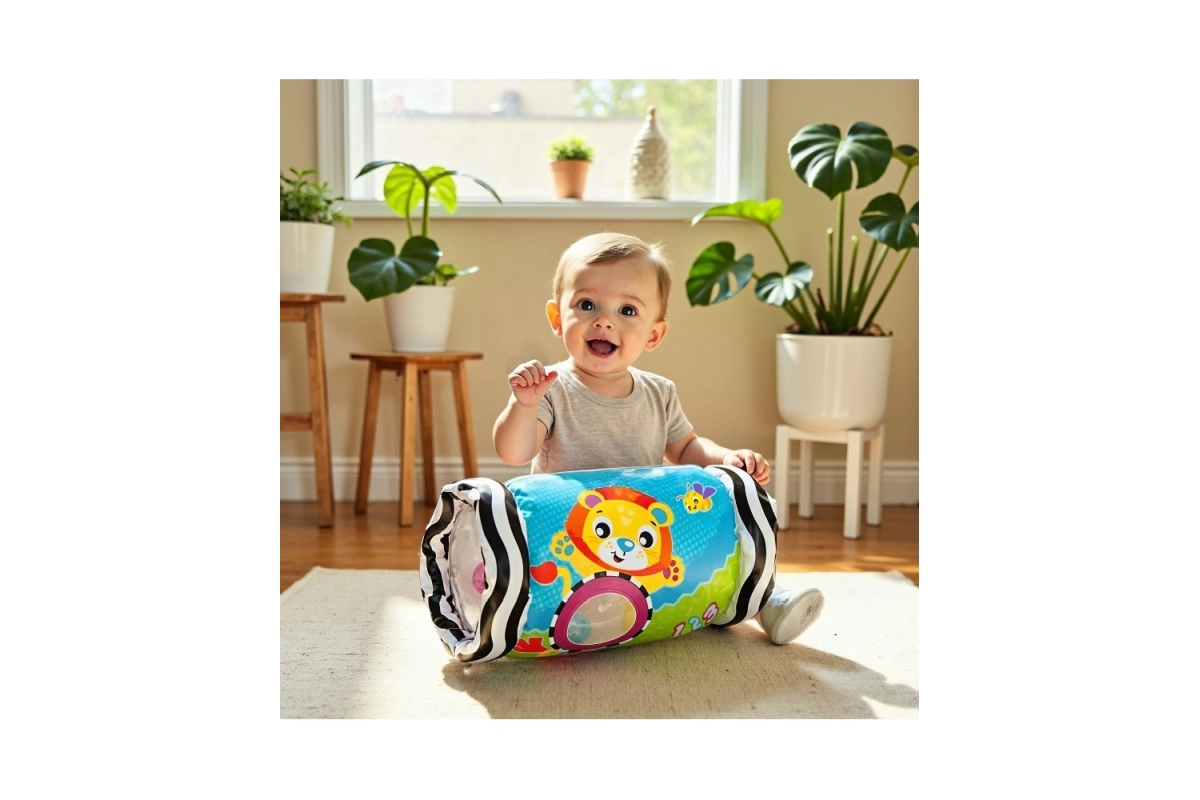 Die zylindrische Form rollt leicht, animiert das Baby zum Greifen, Drehen und Krabbeln und unterstützt so Grobmotorik und Koordination.