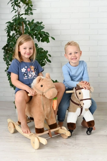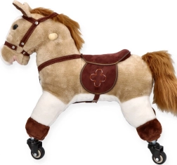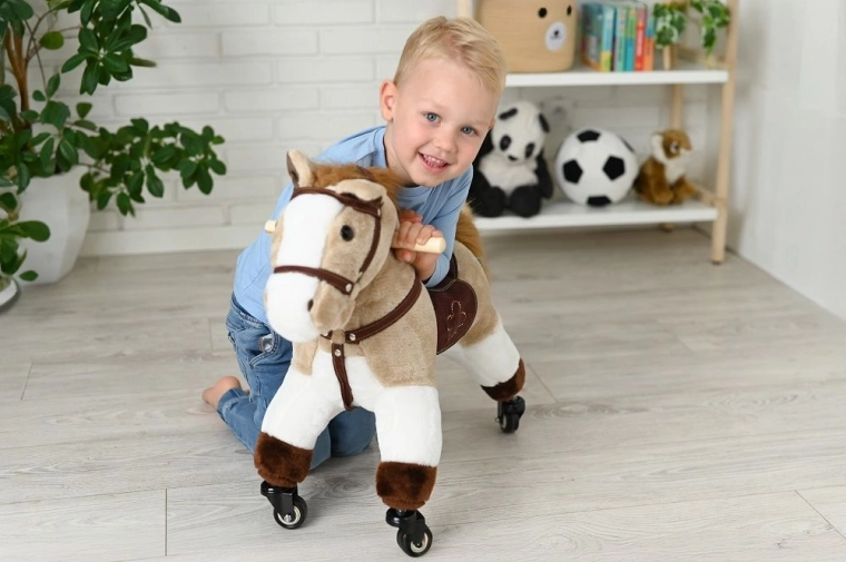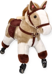 Stilvoller Reitbegleiter für kleine Pferdefans. Solide Konstruktion, weiches Plüschmaterial und flinke Rollen laden zu Fahrten durch Wohnung und Flur ein.