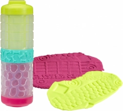 1 Röhre Sand, 1 Röhre Masse, 2 Deckel mit Stempeln, 1 Verbinder/Walze mit Texturen