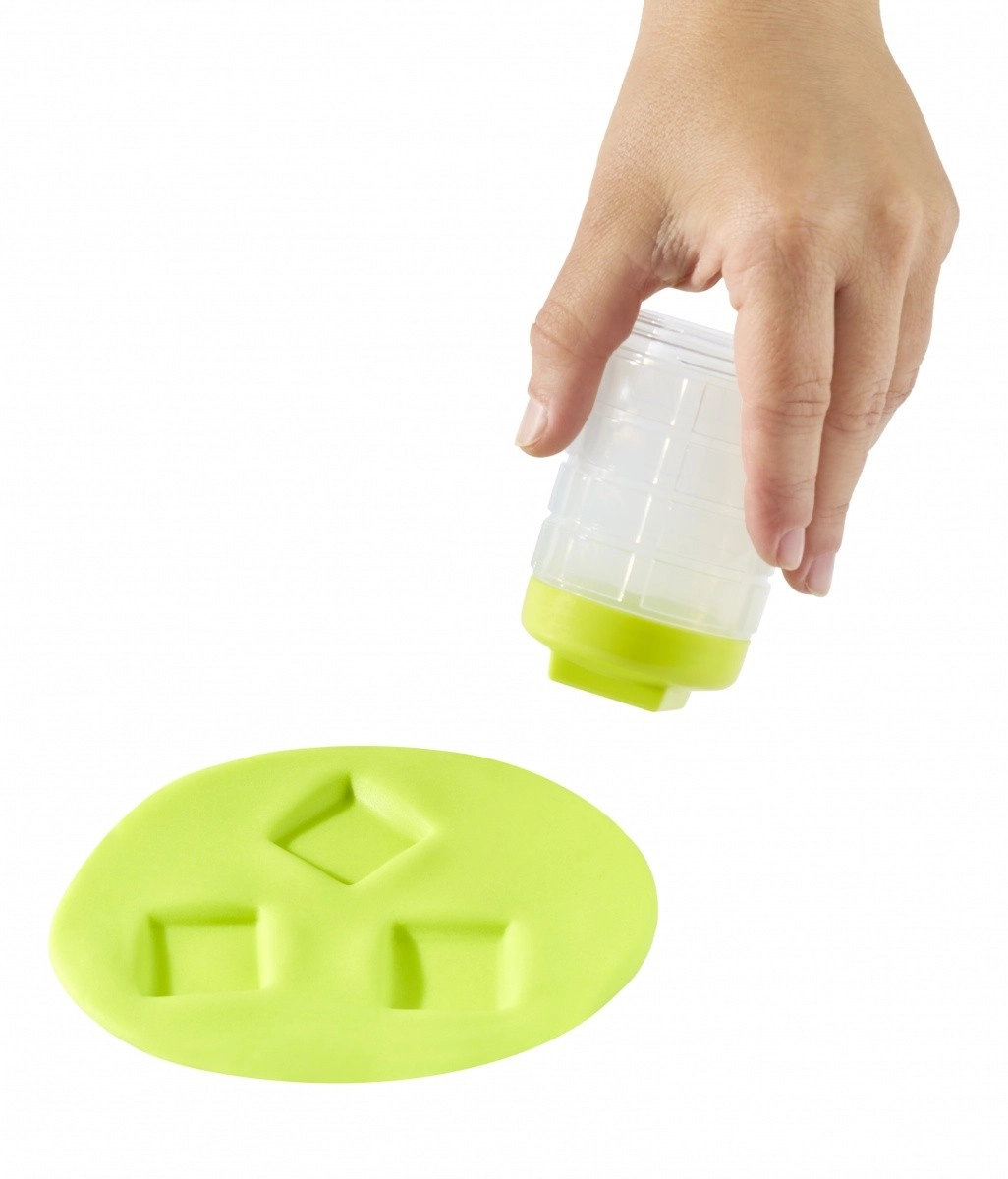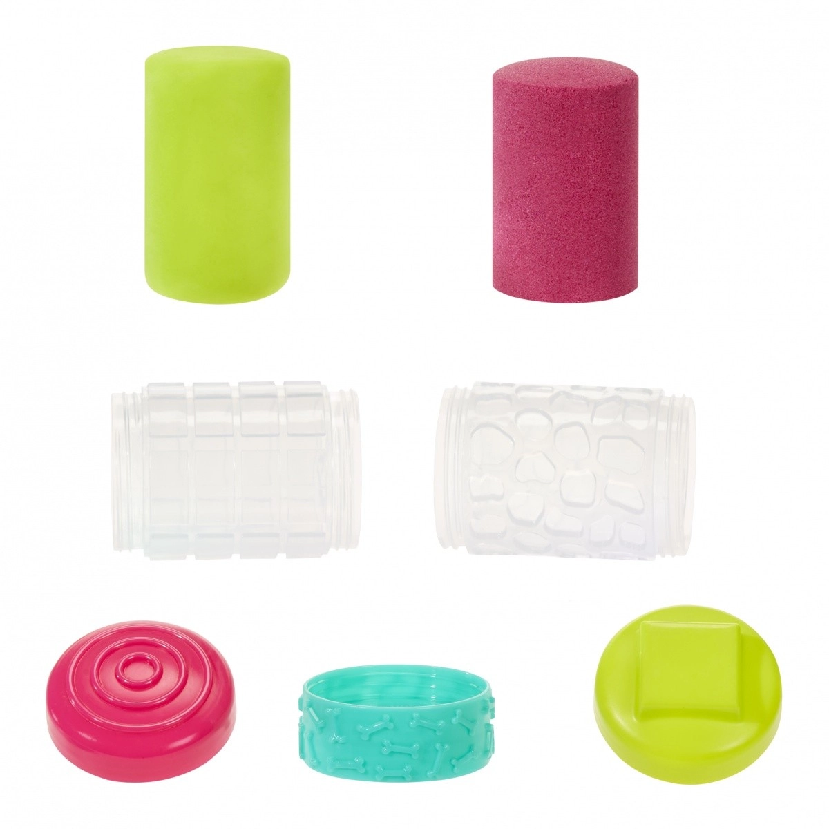 Enthalten ist ein multifunktionales 4-in-1-Werkzeug mit austauschbaren Endstücken zum Ausrollen und Prägen von Mustern. Die nachhaltige, durchdachte Verpackung ist zugleich Teil des Spielkonzepts: Die Deckel dienen als Stempel und der Verbinder als strukturierte Walze. Masse und Sand können kombiniert werden, um eine neue Mischung mit einzigartiger Haptik zu schaffen, die sensorische Wahrnehmung und Kreativität fördert.