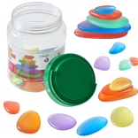 Das Set enthält 36 Elemente in 6 leuchtenden Farben (Gelb, Rot, Blau, Grün, Orange, Lila) in verschiedenen Größen bis zu einem Durchmesser von 8,5 cm beim größten Stein. Unregelmäßige/asymmetrische Formen eignen sich hervorragend für künstlerische Kompositionen, das Erlernen von Begriffen wie größer–kleiner, über–unter sowie zum Trainieren der Hand-Auge-Koordination.