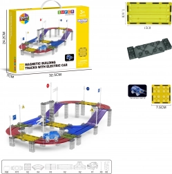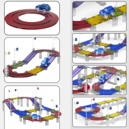 Entdecken Sie die kreative Welt der WOOPIE-Baukasten-Rennbahn, die Fantasie, Kreativität und logisches Denken fördert. Die Magnetteile haften schnell und fest aneinander, sodass Kinder ab 3 Jahren die Montage ohne Werkzeug bewältigen. Die farbigen, transparenten Elemente in Kombination mit dem LED-Auto schaffen eine fesselnde Lichtshow.