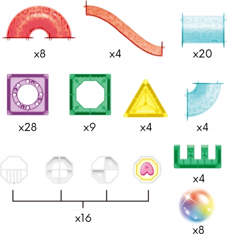 - 28 Quadrate mit rundem Loch, 9 Quadrate, 4 Dreiecke, 8 gebogene Teile (Viertelkreis), 4 gerade Teile, 20 Tunnelteile, 4 U-förmige Teile, 8 Kugeln (leuchtend), 16 Verbinder