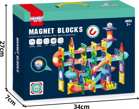 Woopie magnetische 3D-Murmelbahn, 105 Teile. Einfache Verbindung, leuchtende Kugeln und Teile. Fördert Kreativität und logisches Denken ab 3 Jahren.