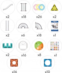 Lieferumfang: magnetische Platten und Elemente der Kugelbahn, Kugeln, illustrierte Anleitungen und Bautipps.