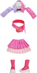 Detailreiches Outfit, gestrickter Rock, stylische Schuhe und pastellfarbene Haare – alles auf den ikonischen Rosaton abgestimmt, der sofort ins Auge fällt.