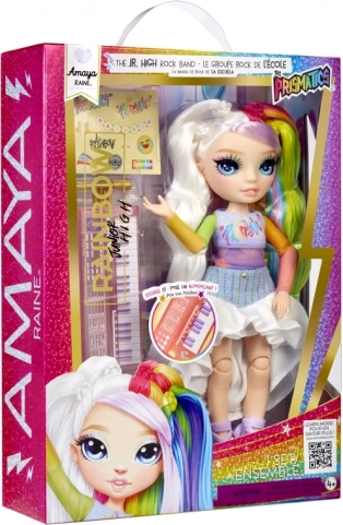 Amaya Raine aus der Rainbow High Jr. High Serie bringt Kindern die Welt der Mode und Musik in einer niedlichen Puppe näher. Dank langer Regenbogenhaare, detailliertem Outfit und Gelenken ist sie bereit für Konzerte, Fotoshootings und zur Präsentation im Regal. Accessoires einschließlich Mini-Keyboard unterstützen das Rollenspiel als Musikstar.