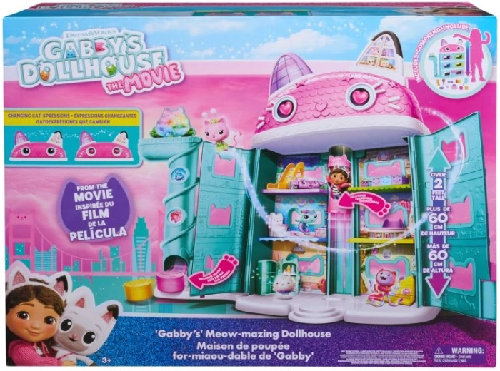 Das Set enthält eine Gabby-Puppe, Möbel und thematische Katzen-Accessoires wie Toilette, Kühlschrank oder Rutsche. Mit dabei ist auch ein Liefer-Turm mit Knopf zum Enthüllen versteckter Schätze sowie Aufkleber zur Gestaltung des Interieurs. Das Haus lässt sich weit öffnen und bietet einen stabilen Bereich für gemeinsames Spielen.