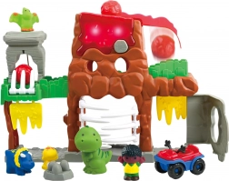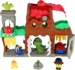 Entdecken Sie eine interaktive Dinosaurierwelt mit Vulkan, Tunneln und beweglichen Elementen, die zum kreativen Spiel anregen. Kinder können Steine auslösen, mit dem Fahrzeug fahren, Tore öffnen und spannenden Geschichten mit niedlichen Figuren erfinden.