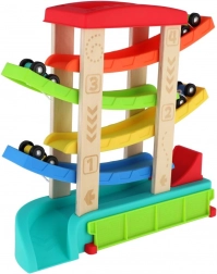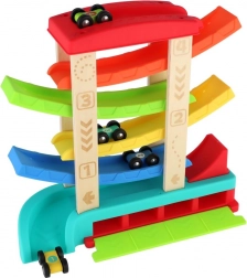 Die bunte Kaskaden-Rennbahn aus hochwertigem Holz und Kunststoff bietet Kindern stundenlangen Spielspaß. Einfach das Auto oben auf die Plattform setzen und zusehen, wie es über die Rampen bis ins Ziel saust. Im Lieferumfang sind 4 Rennwagen enthalten, ideal für kleine Kinderhände. Die Bahn hat eine stabile Konstruktion, glatte Kanten und ist geeignet für Kinder ab 18 Monaten.