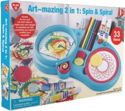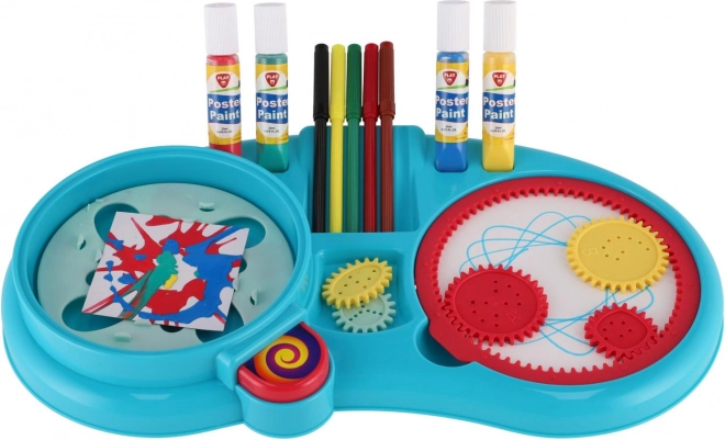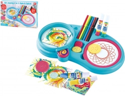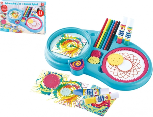 Ein Set, zwei Techniken. Erzeugen Sie perfekte Spiralen mit Zahnrädern oder lassen Sie Farben auf drehendem Papier tanzen für eindrucksvolle Spin‑Art‑Bilder.