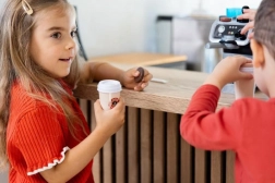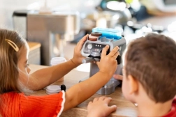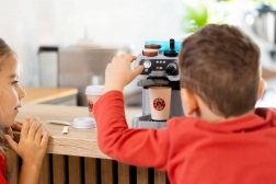 Diese moderne, kinderfreundliche Kaffeemaschine verwandelt die Spielküche in ein kleines Café. Einfach den Wassertank füllen, eine Kapsel einlegen, leicht mit dem Tamper andrücken und den Knopf drücken – schon fließt Wasser in den Becher wie bei einem echten Espresso. Ideal für kreatives Rollenspiel mit Freunden, Geschwistern oder Kuscheltieren.