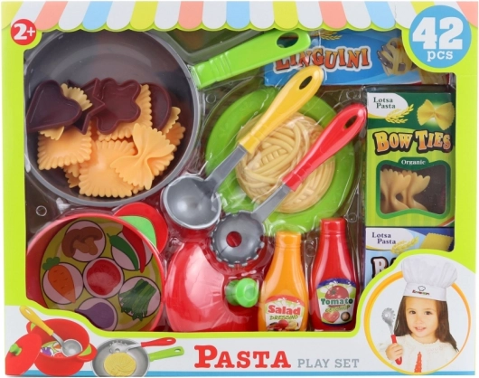 Kunststoff-Set mit Essen und Geschirr für Kinder ab 2 Jahren: Topf, Pfanne, Teller, Schöpflöffel, Nudeln und Zubehör. Leicht, sicher und ideal für Kochspiele.