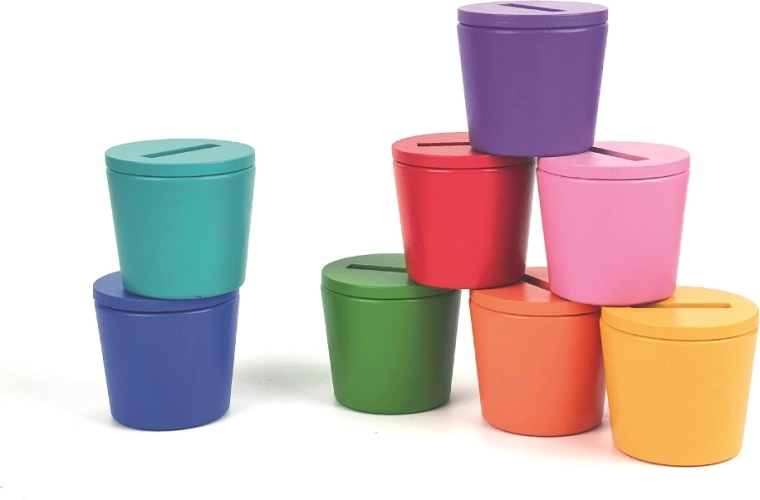 • Becher mit Deckeln und Schlitzen zum Einwerfen von „Münzen“