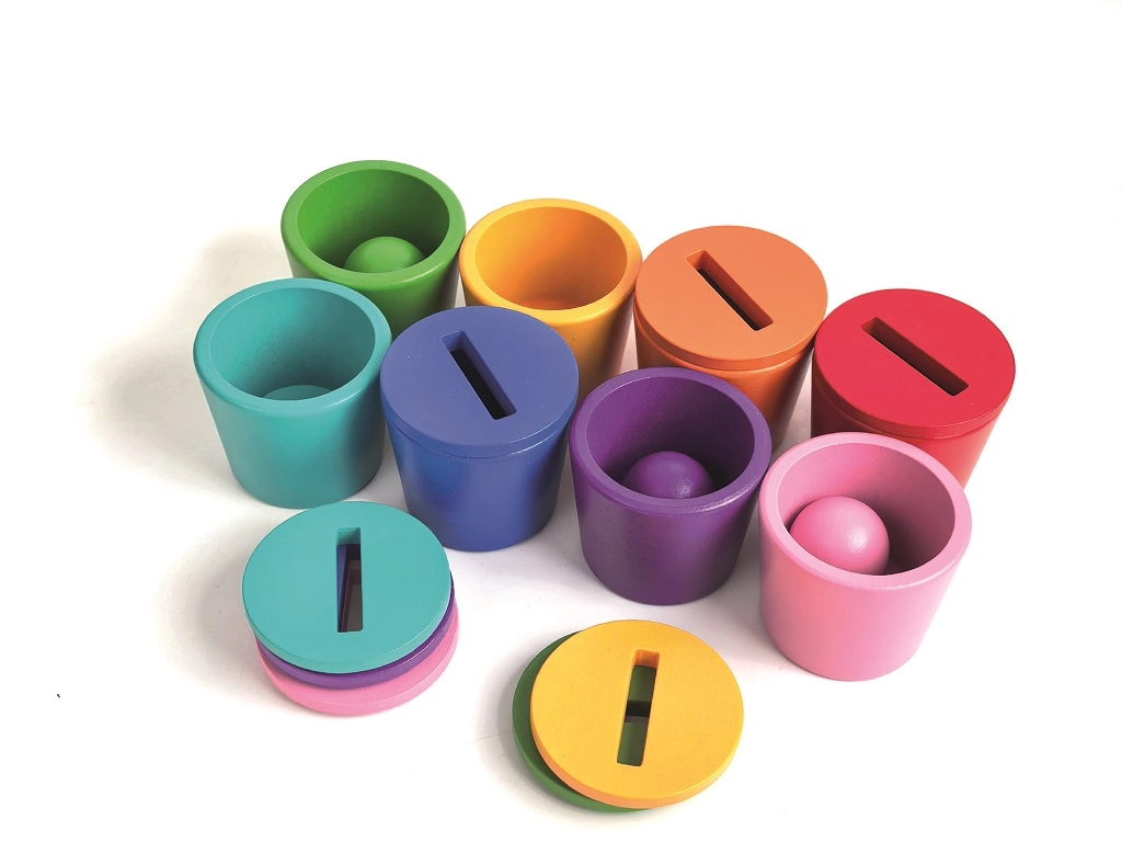 Bunte Becher mit Deckeln und Schlitzen ermöglichen das Einwerfen von Scheiben und fördern Konzentration, Geduld und die Entwicklung motorischer Planung.